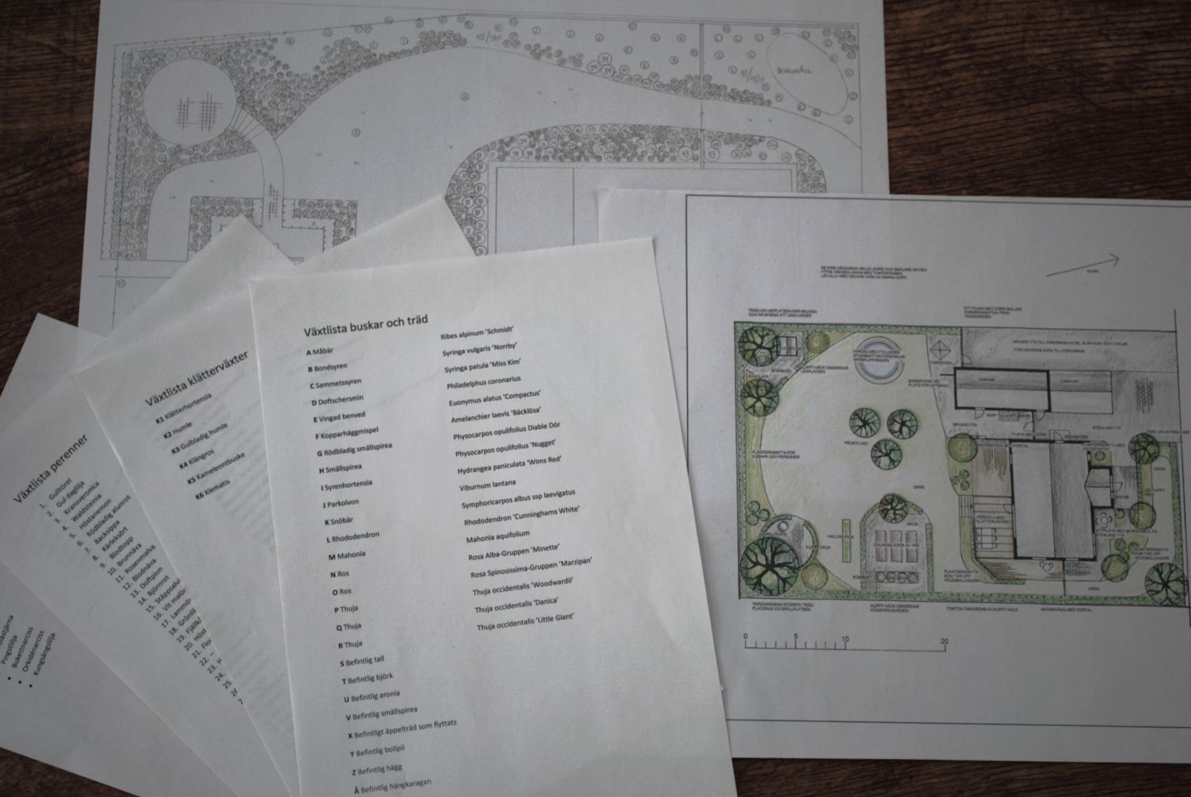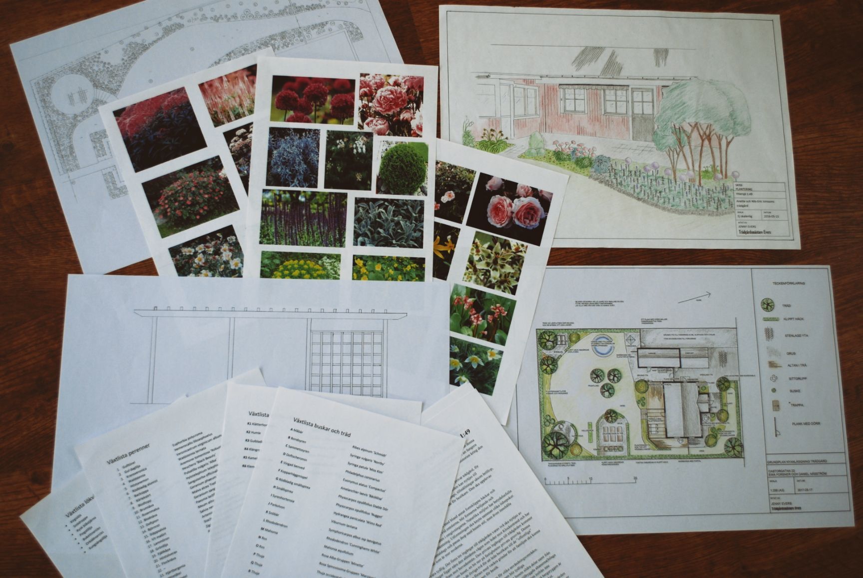 Exempel på innehåll i Lilla designpaketet. Trädgårdsritning i färg, planteringsritning samt växtlistor.
